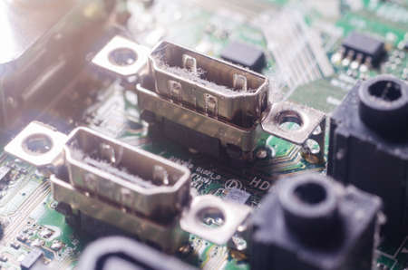 closeup HDMIHigh-Definition Multimedia Interface which is a proprietary audiovideo interface for transferring uncompressed video data and compressed or uncompressed digital audio data