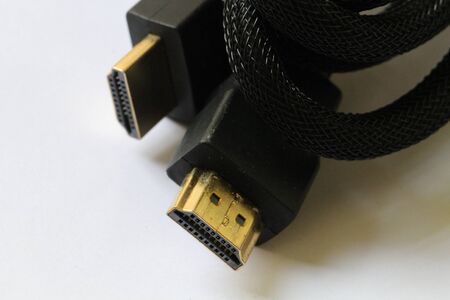 HDMI plug, cable closeup on white background, macro.