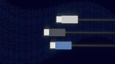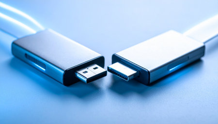 A macro shot of glowing USB-A and USB-C connectors poised to connect on a futuristic blue background.