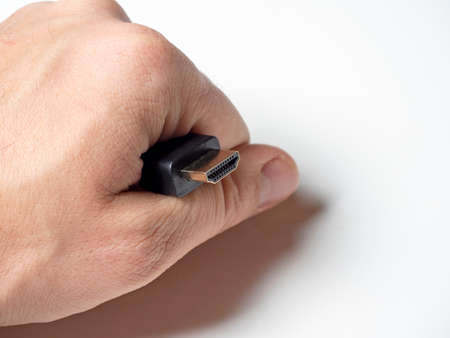 HDMI plug in hand on white background.