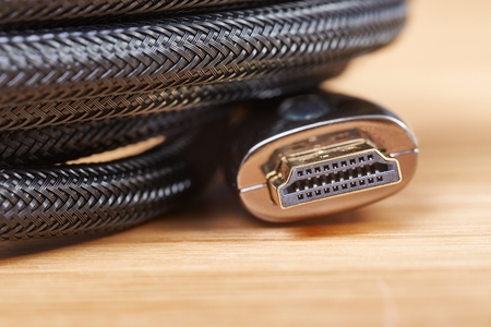 HDMI cable on a wooden background