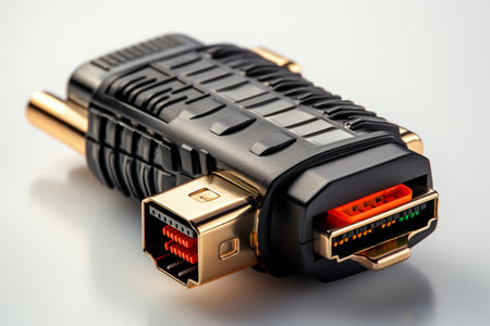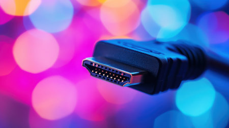 This vivid close-up image shows an HDMI cable connector against a colorful backdrop. Ideal for technology-related content, showcasing connectivity and modern devices.