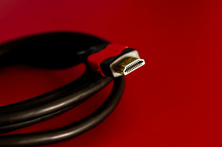 Photo of red colored hdmi cable close-up.