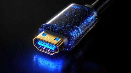 This close-up image features HDMI cables with illuminated connectors on a reflective surface, creating an engaging visual with a blurred colorful background, perfect for tech-themed projects.