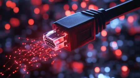 A detailed close-up image showcasing digital cables with illuminated connectors, reflecting vibrant lights in a modern technological setting.