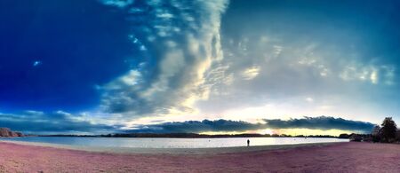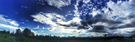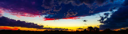 Panorama Sunset with ray light on clouds in a blue and orange sky in twilight time