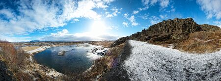 Aerial panoramic 360 degrees view of Jokullsarlon Glacier Lake and Icebergs at sunset, Iceland.