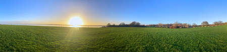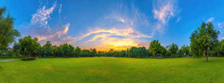 A wide landscape displays a vibrant green field bordered by trees under a colorful sky at sunset. The composition features a natural environment with a dynamic interplay of light and shadow, and could be used for various commercial or editorial applications. The image suggests a sense of peace and tranquility.