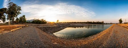 Panorama view of reservoir with mountain view at sunset, Chiang Mai province.