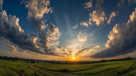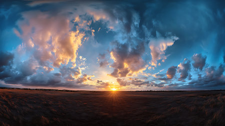 Golden sunset sky pano with Cumulus clouds. Seamless hdr panorama in spherical equirectangular format. Complete zenith for 3D visualization, game and sky replacement for aerial drone 360 panoramas.