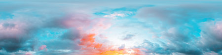 Sunset sky panorama with bright glowing pink Cumulus clouds. HDR 360 seamless spherical panorama. Full zenith or sky dome for 3D visualization, sky replacement for aerial drone panoramas.