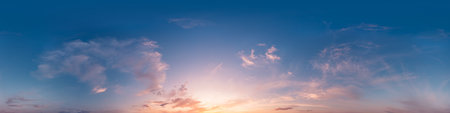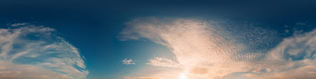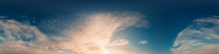Bright sunset sky panorama with Cirrus clouds. Seamless hdr spherical equirectangular 360 panorama. Sky dome or zenith for 3D visualization, game and sky replacement for aerial drone 360 panoramas.