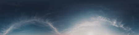 Dark blue sunset sky panorama with Cirrus clouds. Seamless hdr pano in spherical equirectangular format. Complete zenith for 3D visualization, game and sky replacement for aerial drone 360 panoramas.