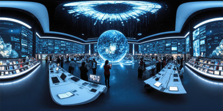 Futuristic library with holographic books A sprawling library featuring sleek, glowing shelves filled with holographic books and data cubes. The central area is