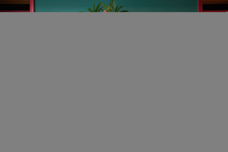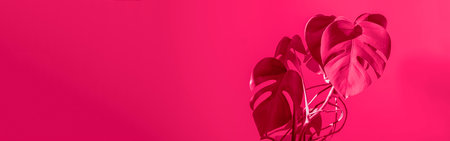 Banner. Monstera flower in a white pot on a gray background. The concept of minimalism. Monstera deliciosa or Swiss cheese plant in pot tropical leaves background. Daylight, harsh shadows