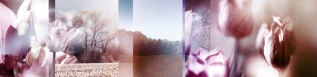 Facets of Tulips and Landscapes. Collage, photomontage on panorama view. Nature, colors, beauty, grief, mourning, memories, concept.