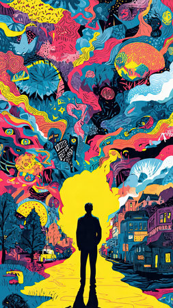 Man standing on the road in the city. Street art. Vector illustration.