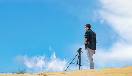 Man setting up mobile phone on tripod for photography and video making in sand hills. Cloudy sky on background. Travel photographer concept.