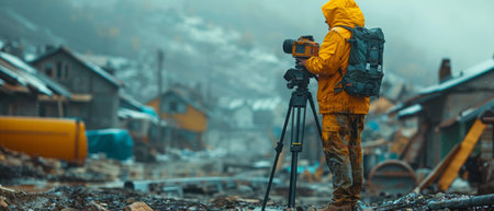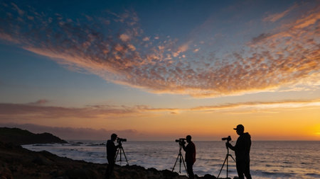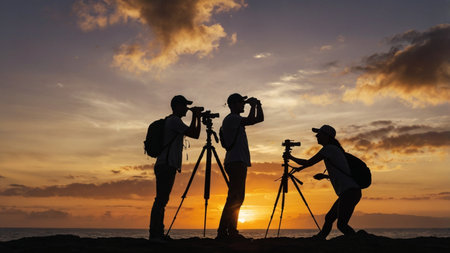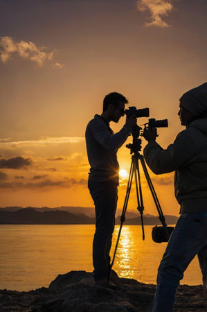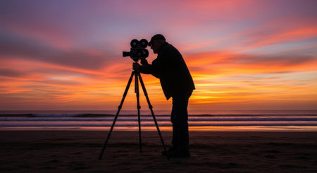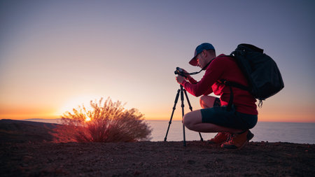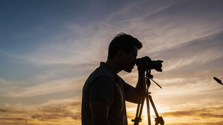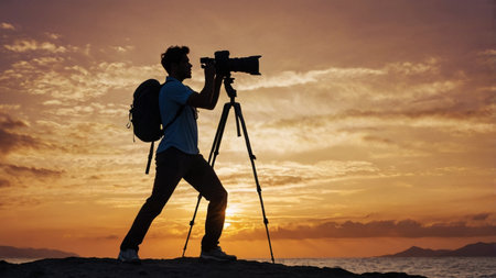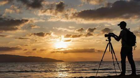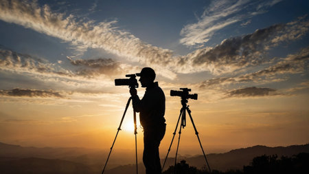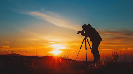Photographer captures stunning sunset landscape with SLR camera and tripod generated by artificial intelligence