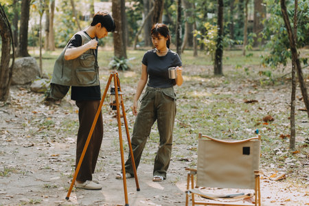 Asian couple sweet in tent inside on they camping trip, traveller relax and sleep togather in out door and camping trip