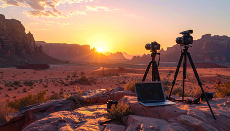 A solitary camera on a tripod captures the essence of a breathtaking sunset in a desert landscape, with majestic mountains and dramatic clouds creating a serene atmosphere.