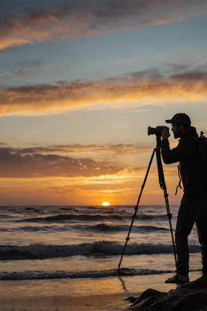 Silhouette of photographer with camera and tripod on the beach at sunset