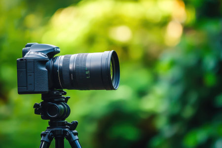 DSLR camera on tripod with green background.