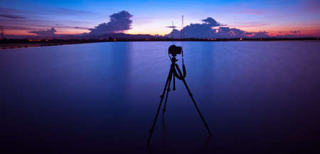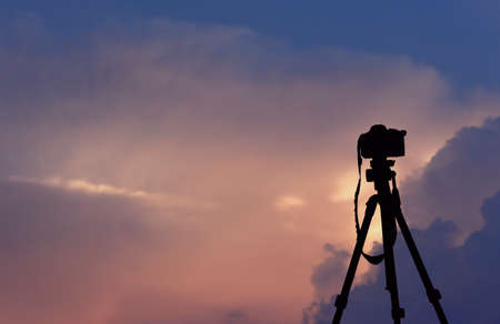 photo camera with tripod At sunset, dusk, colors and shapes of clouds