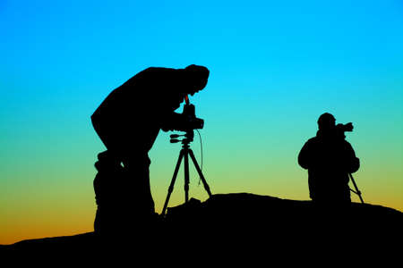 Silhouette of photographer with camera and tripod on sunset background.