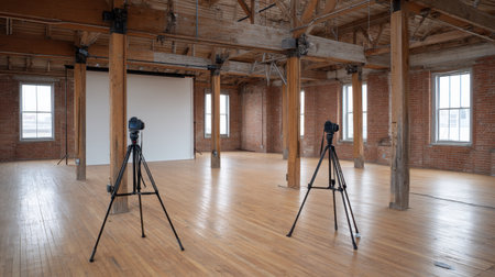 An inviting photography studio featuring wooden floors, large windows, and a minimalist design. It offers an ideal setting for creative projects and artistic captures.