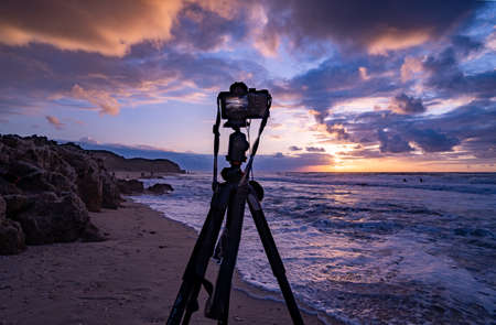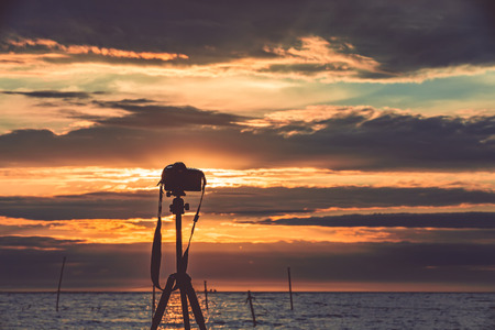 Professional camera on tripod taking picture film video of sunrise over sea.