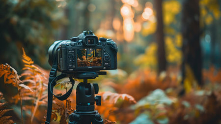 A DSLR camera on a tripod capturing a beautiful autumn forest scene, showcasing colorful foliage and serene natural beauty.