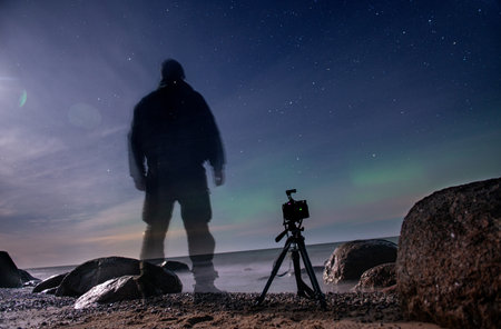 Traveler shooting northern lights on the seashore under a starry night sky with a tripod.