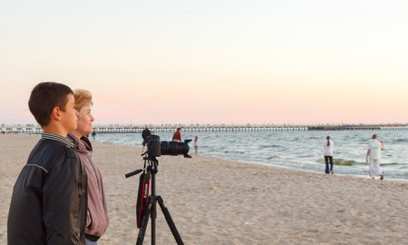 Palanga, Lithuania - July 17, 2014: Photographers on the beach in Palanga at sunset.