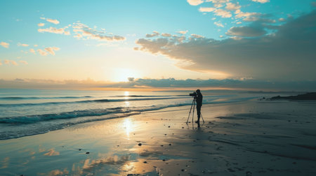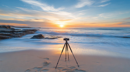 Captivating scene of a tripod and camera gracefully positioned on a sandy beach during sunset, with vibrant colors painting the sky and reflecting on the tranquil water.
