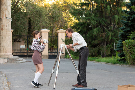 An astronomy teacher and a girl carefully set up a telescope outside on the observation deck.