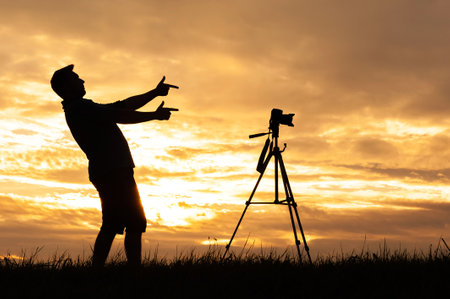 A silhouette of a man playfully framing a shot with his hands next to a camera on a tripod at sunset. The scene captures creativity and spontaneity during golden hour.