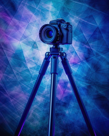 An AI-generated illustration of a digital camera on a tripod against a vibrant and colorful background.