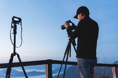 Photographer with camera on tripod at sunset. Man during photographing beautiful mountain landscape above clouds.