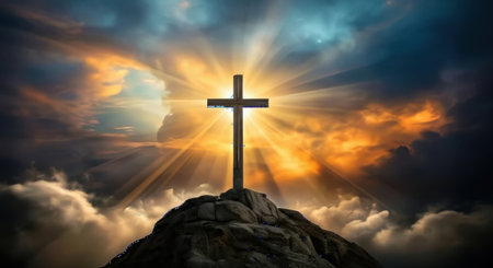 A wooden cross stands atop a rocky peak, illuminated by radiant golden light breaking through dramatic clouds.