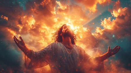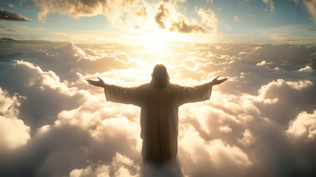Jesus Christ stands illuminated by divine light, symbolizing love, faith, and salvation as He ascends to heaven in a breathtaking celestial scene.