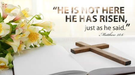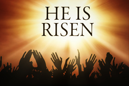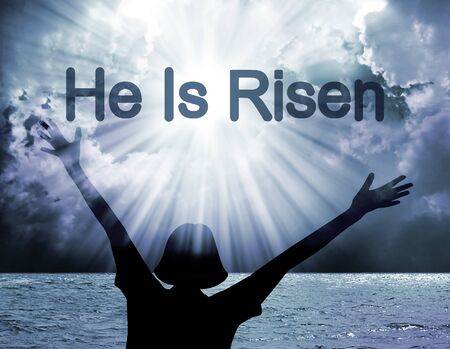 He is risen - lettering calligraphy on abstract background with clouds. Religion concept.