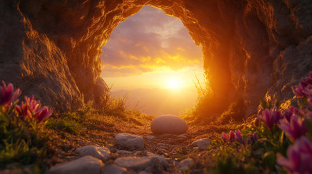 Warm sunlight shining through cave entrance at sunset over peaceful valley with colorful flowers