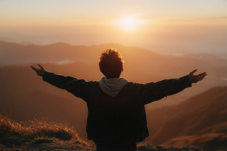 A person stands on a mountain ridge with arms outstretched, welcoming the first light of dawn. The vibrant colors of sunrise illuminate the calm landscape.