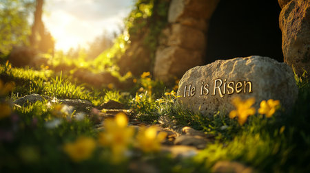 A stone with the inscription He is Risen bathed in sunlight, surrounded by vibrant flowers in a peaceful garden setting, symbolizing hope and resurrection.
