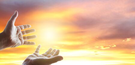 Ascension day concept: Jesus Christ hands showing scars for Thomas over blurred sunset background