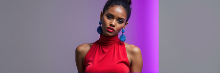 Young african female in red dress with blue earrings and purple background.