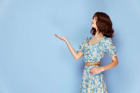 Woman in flower dress Holds hand in front of him, side view Copy Space