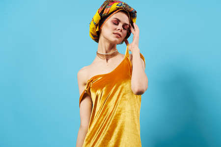pretty woman in multicolored turban attractive look Jewelry smile isolated background
