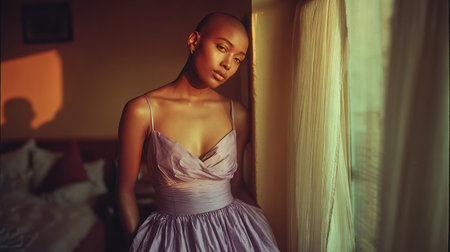 Elegant woman wearing a purple dress is posing by a window, with soft sunlight illuminating her features and creating a warm atmosphere.